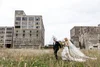 bride and groom walking through field in Milwaukee’s Walker’s Point